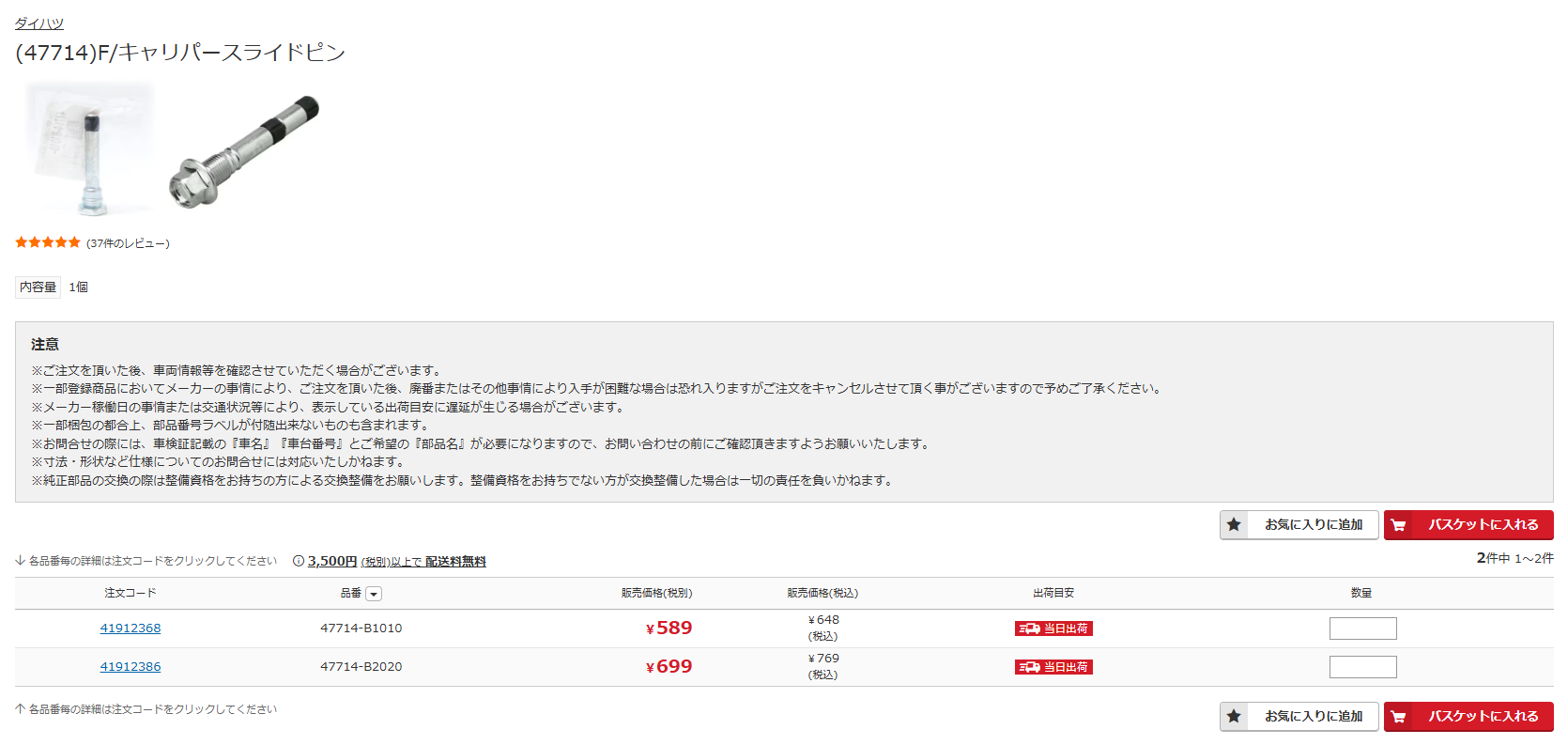 ちなみに左から2つめの「(47714)F/キャリパースライドピン」は検索結果に出てきていましたが、適合する部品ではありません。 詳細ページに入って「品番」を確認すると、「47714-B1010」と「47714-B2010」という品番が確認できますが、 今探している部品は「47715」から始まるものなので微妙に違いますね。 このように自動車部品の中には品番がほとんど同じにも関わらず、適合しない部品があるので注意しましょう。